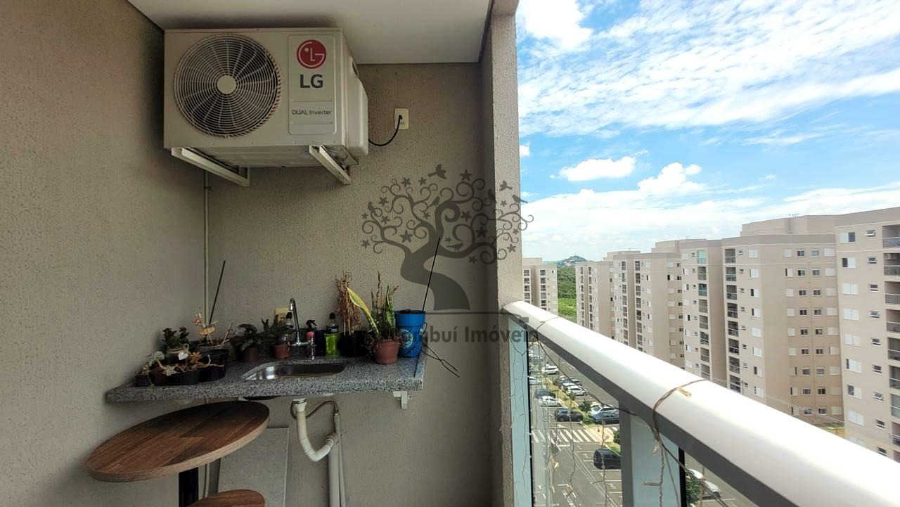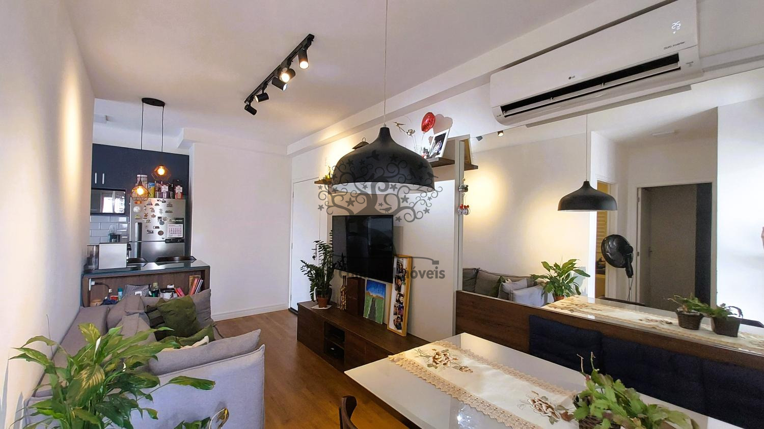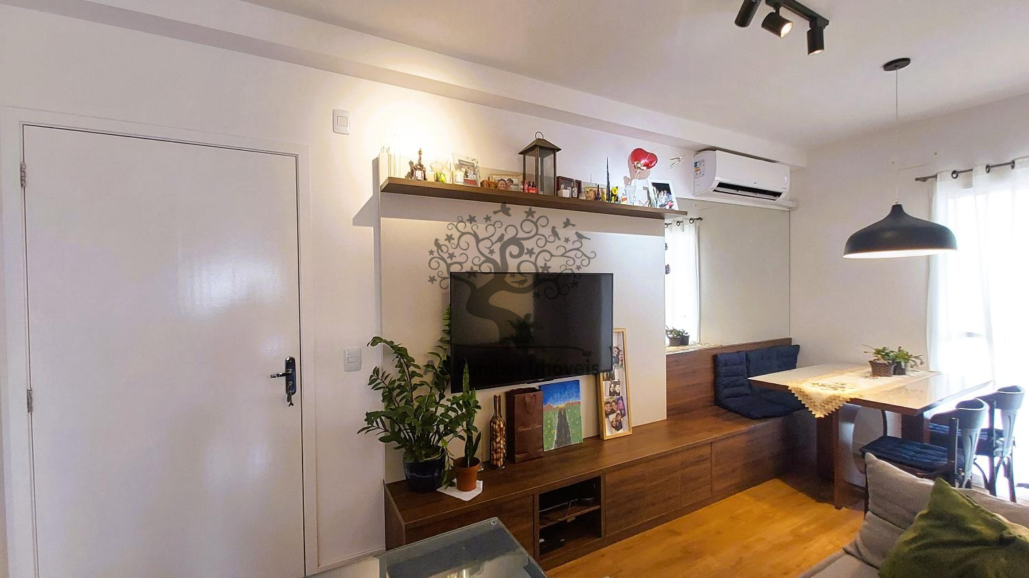 A sala para dois ambientes é aconchegante, conta com ar-condicionado e se integra à varanda com pia, que oferece uma vista agradável e ótima iluminação natural. O banheiro é completo e bem distribuído. O imóvel transmite uma atmosfera acolhedora, com acabamento pensado para o dia a dia.