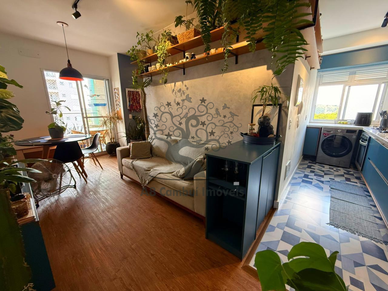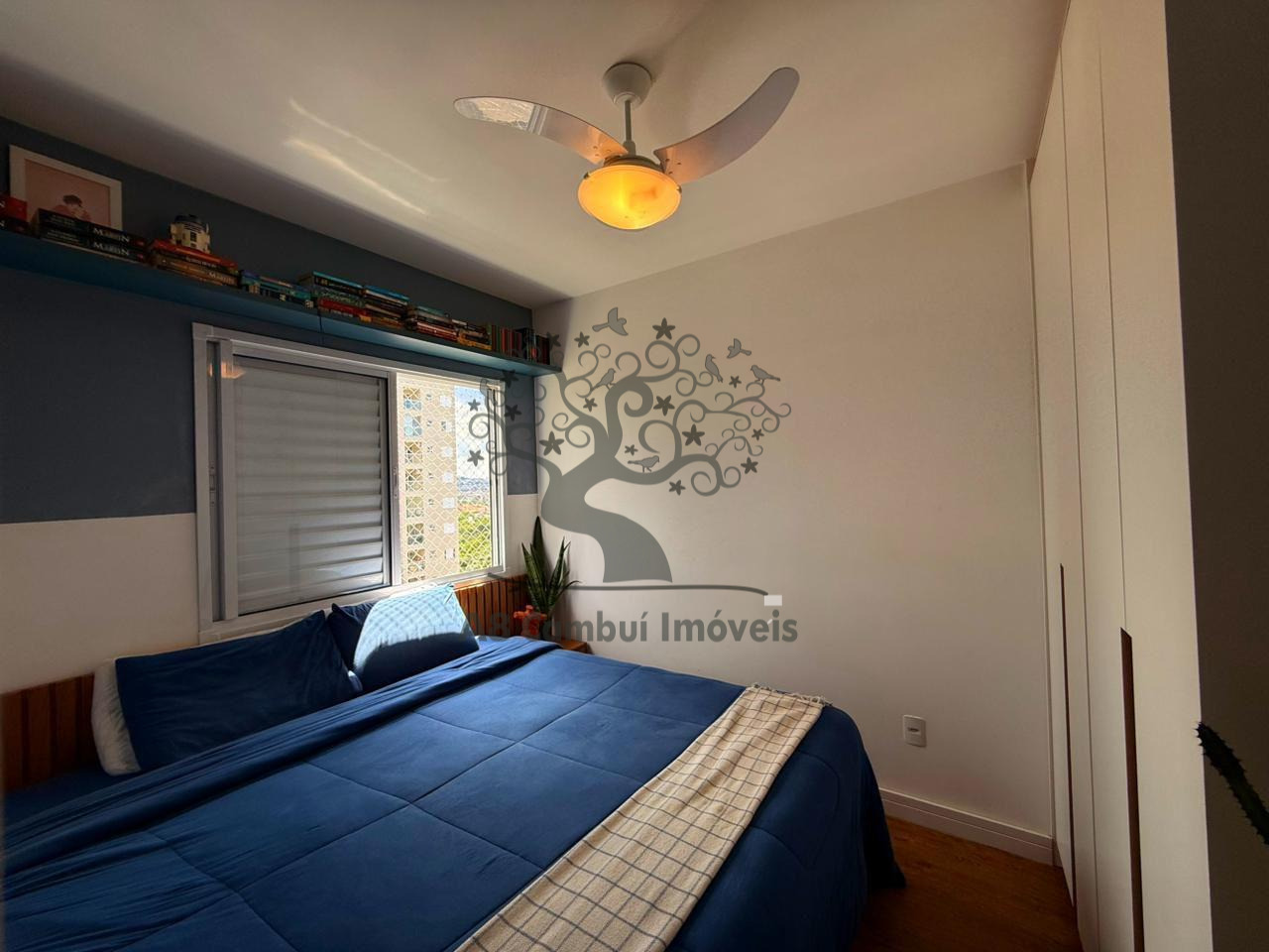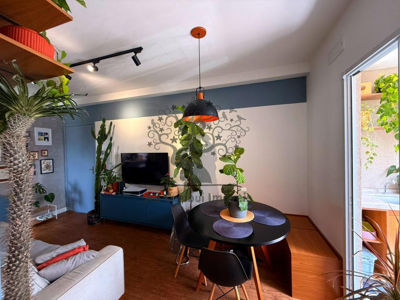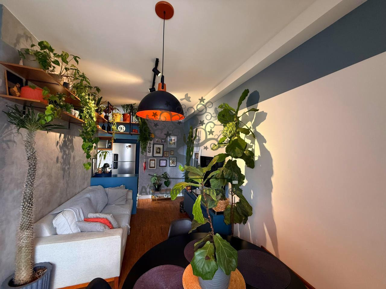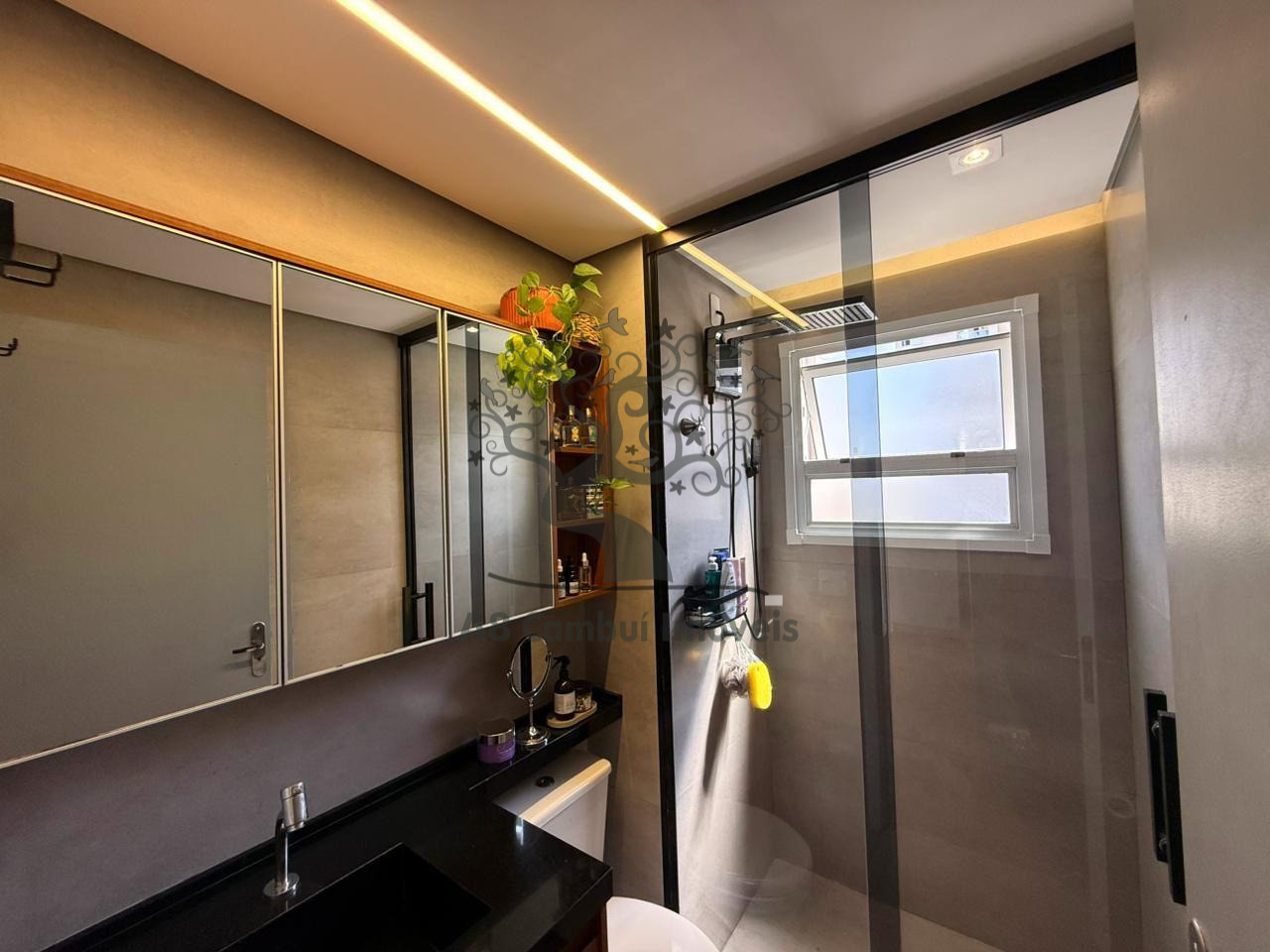 São 2 dormitórios com armários planejados, sendo o quarto de casal com espaço para cama King e o segundo dormitório adaptado para home office, com janela voltada para área de preservação ambiental (APP) dentro do condomínio, garantindo privacidade e contato com a natureza. A sala é para dois ambientes, conta com painel, rack, banco alemão com baú, iluminação diferenciada e prateleiras suspensas.