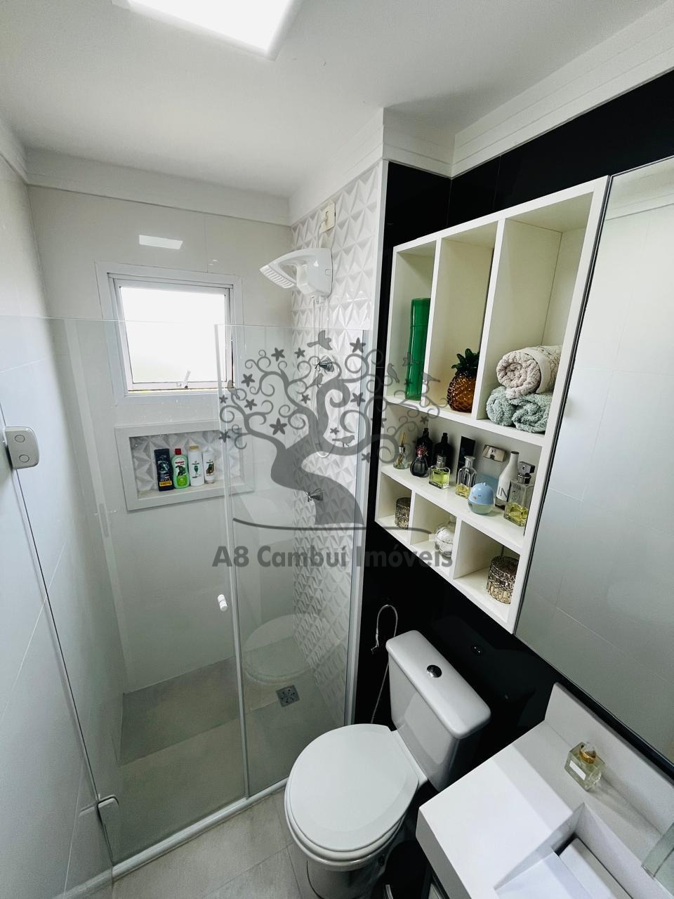 01 com armário embutido e espelho, 01 com escritório completo e armários planejados, Banheiro com móveis planejados, cuba moderna, espelho, nichos e box tipo Blindex
