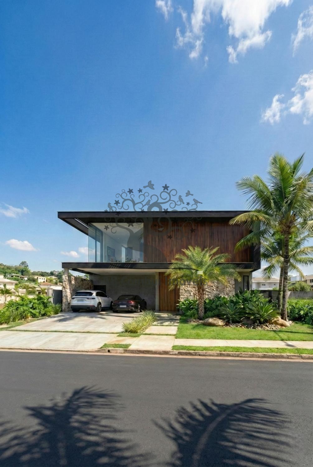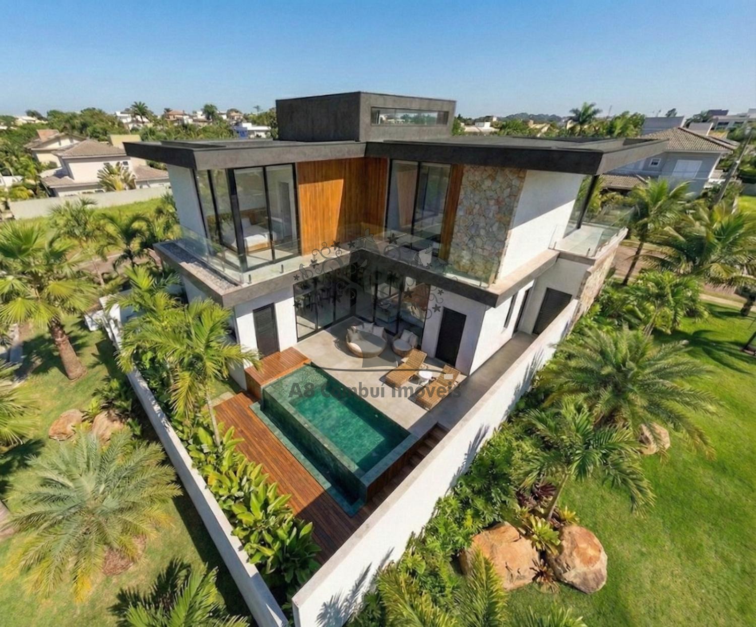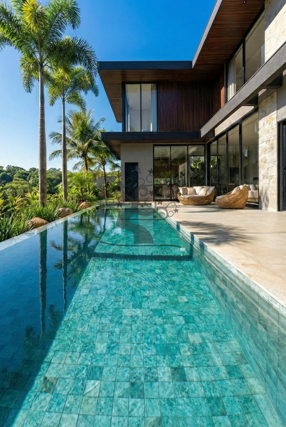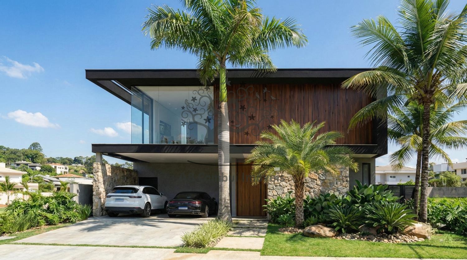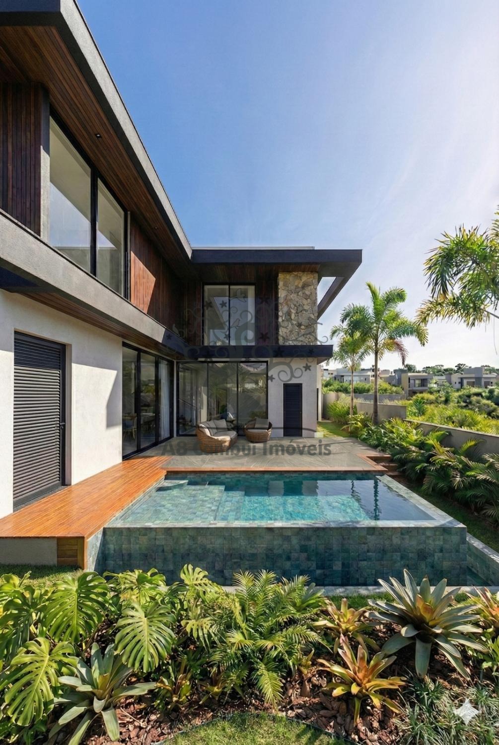 Piscina com borda infinita, valorizando a vista e o lazer, Fachada moderna com materiais nobres e paisagismo, Garagem para 2 veículos, Projeto pensado para sofisticação, funcionalidade e bem-estar, Destaque especial para a integração com a área verde, garantindo privacidade, tranquilidade e contato direto com a natureza — um dos grandes diferenciais deste imóvel.
